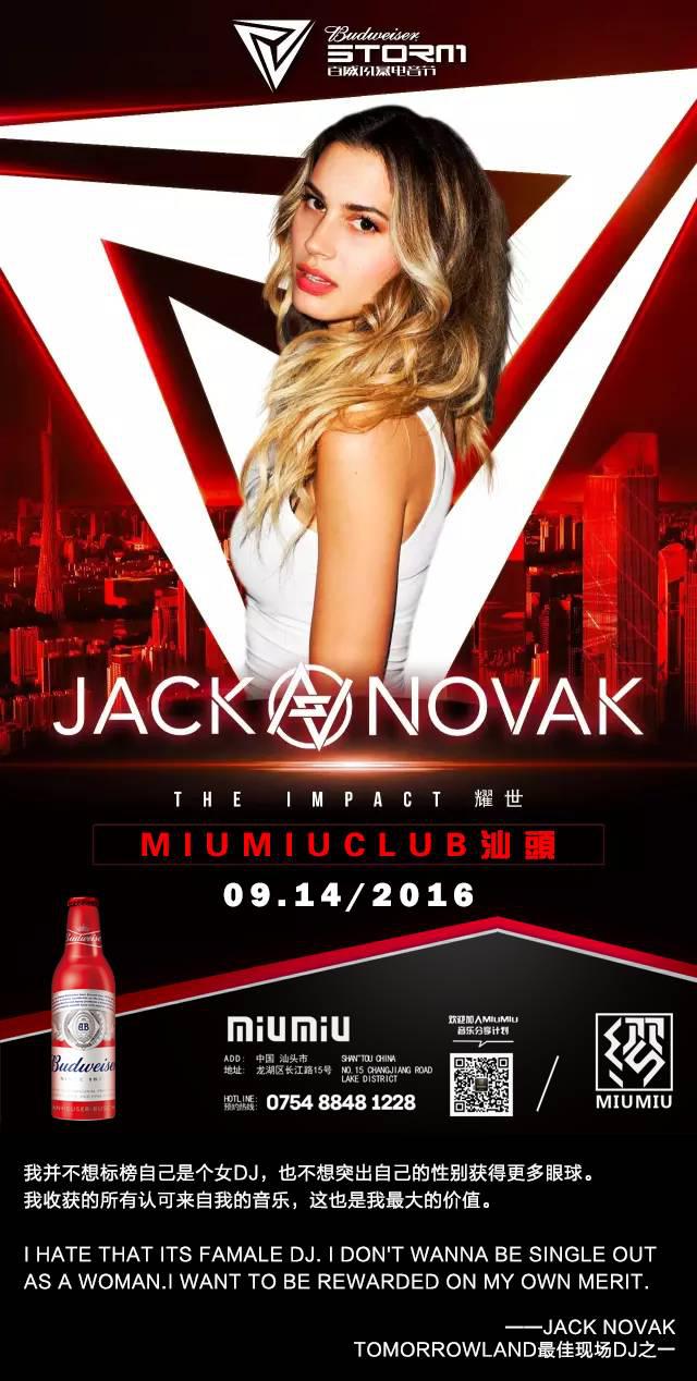 9 月14日,百威风暴电音节狂欢延续,国际知名新生代女DJ Jack Novak将为汕头电音爱好者带来世界顶级的电音表演!颜值与实力兼备的Jack Novak,首张电音专辑《Power and Light》中收录的两首单曲便收获超过四百万次的惊人点击量,好评如潮,众多国际媒体纷纷寓言她的出现打破了“女DJ已死”的谬论,曾和Martin Garrix, Calvin Harris, Hardwell, David Guetta, Tiesto, Rihanna等众多世界大牌DJ与歌手合作或同台演出过,同时也是Pharrell Williams在2013年巡回演唱会的御用DJ,在2015年的DJMAG杂志加入了投票册封她为2016年世界顶级值得关注的定级DJ并进入2016世界百大DJ候选人行列。